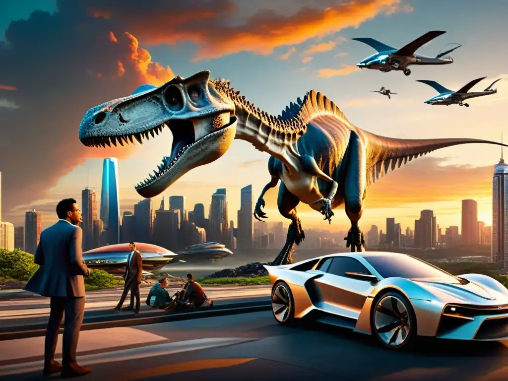 La imagen muestra dinosaurios en arte conceptual, gigantes esculturas detalladas que contrastan con la modernidad de una ciudad futurista