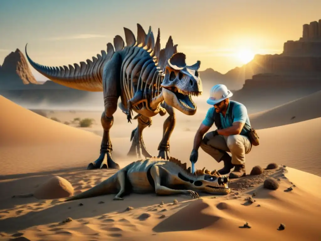 Un paleontólogo excavando un fósil de dinosaurio en el desierto, destacando la precisión en paleontología de dinosaurios